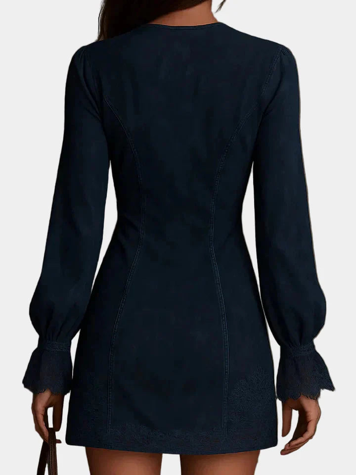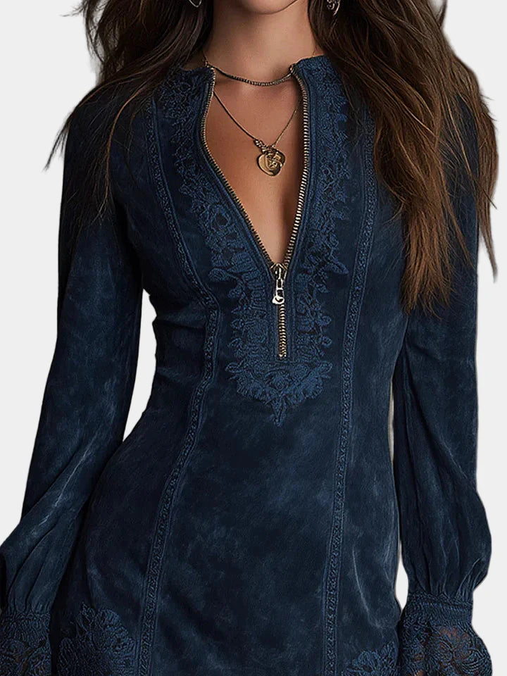 Mini haljina od antilopa s čipkom - Usvojite bezbrižnu boemsku privlačnost s ovom nevjerojatnom mini haljinom u bogatoj, ponoćno plavoj nijansi. Izrađena od plišanog, reljefnog materijala, ova haljina ima laskavu A-liniju koja lijepo obavija tijelo.