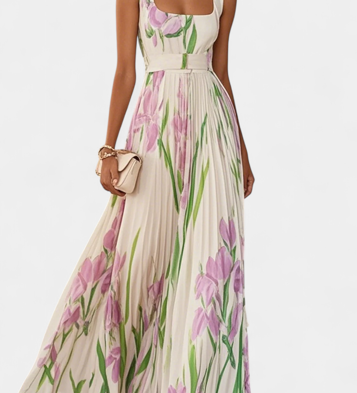 Calanthe Dugačka Plisirana Haljina s Cvjetnim Uzorkom i Kvadratnim Dekolteom